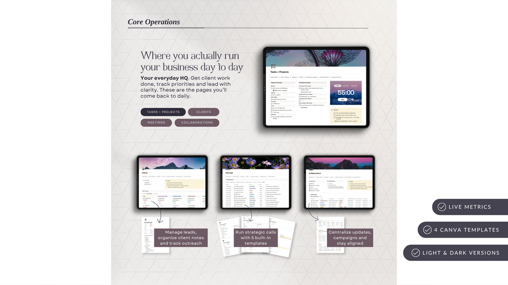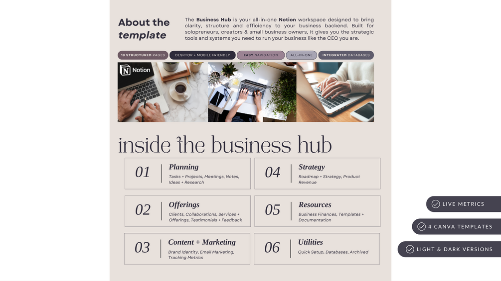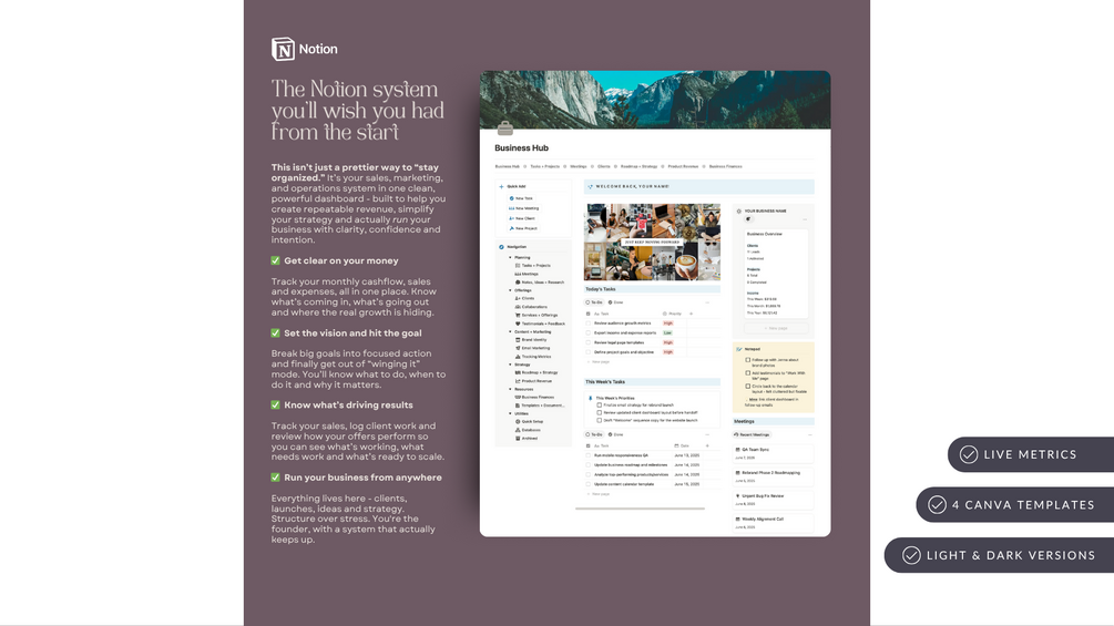 The Business Hub is your all-in-one Notion workspace designed to bring clarity, structure and efficiency to your business backend. Built for solopreneurs, creators & small business owners, it gives you the strategic tools and systems you need to run your business like the CEO you are.