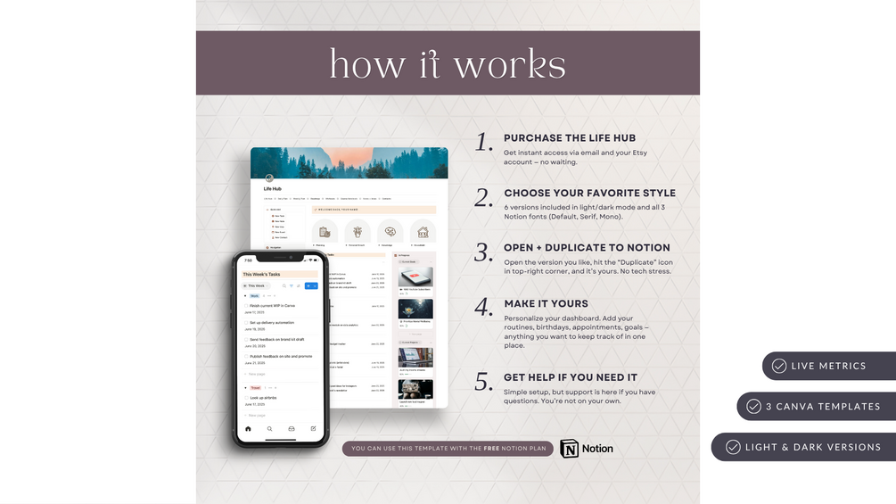 The Life Hub is your all-in-one Notion workspace built to organize your routines, habits and goals with clarity and intention. Made for creatives, planners & growth-minded individuals, it gives you the tools you need to manage your life with more focus, flow and follow-through.